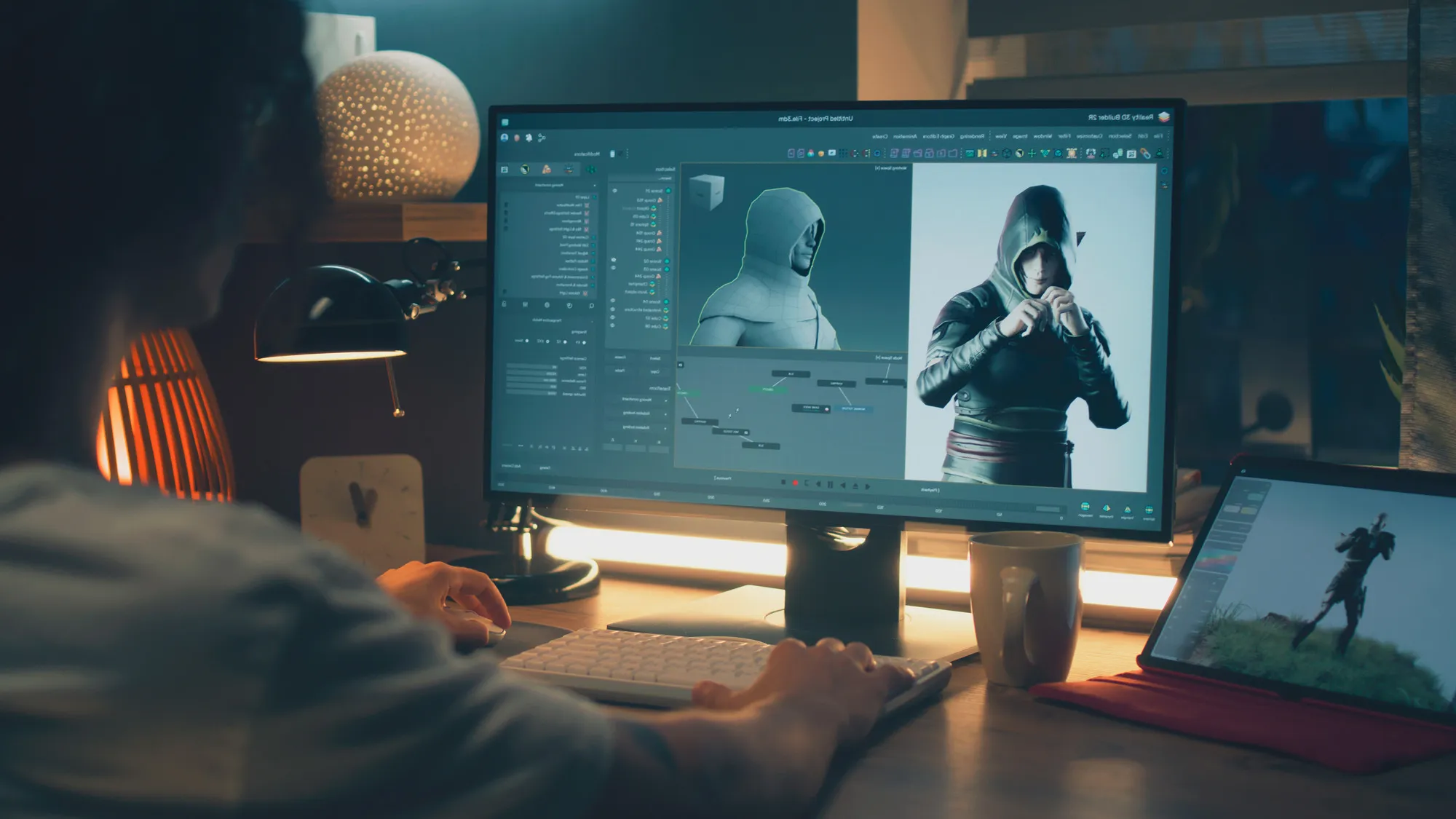 9. Desarrolla labores de producción relacionadas con el modelado, concept-art de personajes y escenarios, animación, texturizado e interfaces de juego y recopilación de documentación de material artístico (artbook) para la construcción de ambientes virtuales.